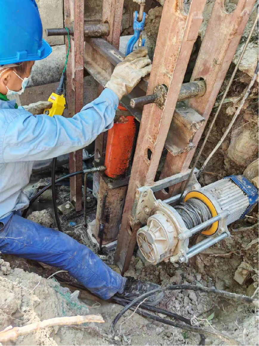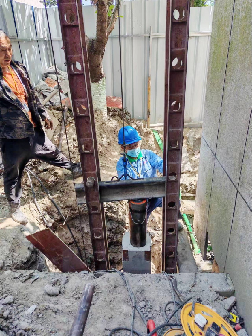 本項目位于上海市青浦區(qū),現(xiàn)場發(fā)現(xiàn)樓梯間墻體傾斜,為滿足使用要求,需對基礎(chǔ)進(jìn)行加大截面及增加靜壓錨桿樁加固。